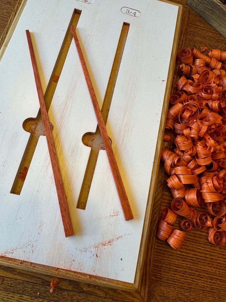 After we snacked, we start making chop sticks. You select the wood you want. We choose Purple Heart and Predoo woods. You then use their forms to shave them into the right shape.