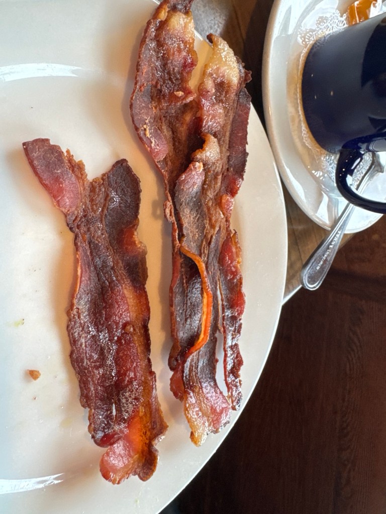 We got breakfast at the lodge – Elliott got steak again and I added a side of bacon. Now, bacon is perhaps in my top five favorite foods but I am not a big fan of crispy bacon – my friend feels…keep cooking it until it’s nearly burnt is his game. When the bacon came out, it was his style all the way.